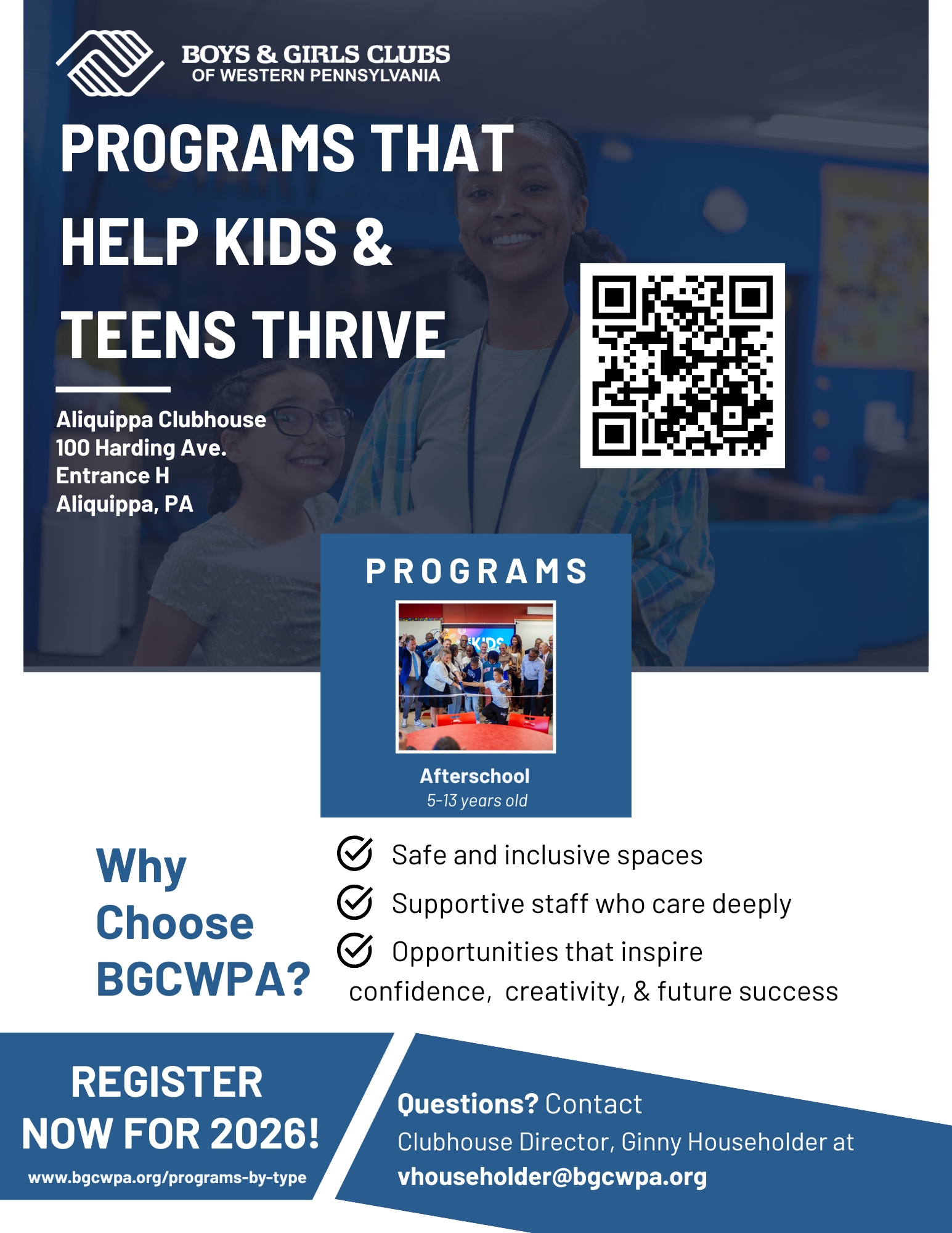 Provides enriching after-school and summer camp programming with daily rotations right inside the Aliquippa building. Child must have completed or be currently enrolled in Kindergarten and can be up to 13 years old. We also partner with community programs to bring more fun to our clubhouse!